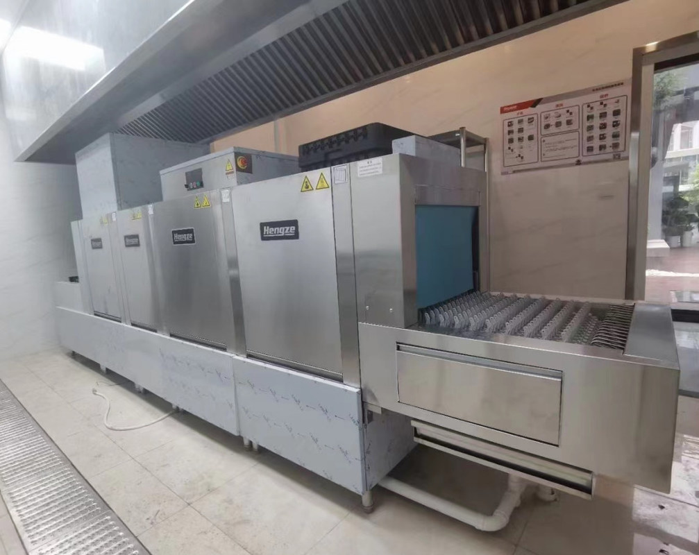A máquina de lavar louça tem uma cinta transportadora que move as prateleiras de pratos através do processo de limpeza. Isso permite que os pratos sejam facilmente limpos em tempo hábil.Também tem várias zonas de pulverização onde são usados jatos de água de alta pressão e detergente para garantir a limpeza completa dos pratosAlém disso, pode haver uma estação de pré-lavagem onde os pratos podem ser pré-lavados antes de entrar no ciclo de lavagem principal.gordura, e partículas de comida dos pratos.